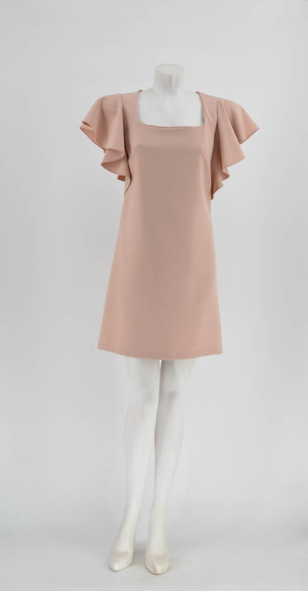 Mini dress in a straight line with a square neckline and ruffles on the sleeves.