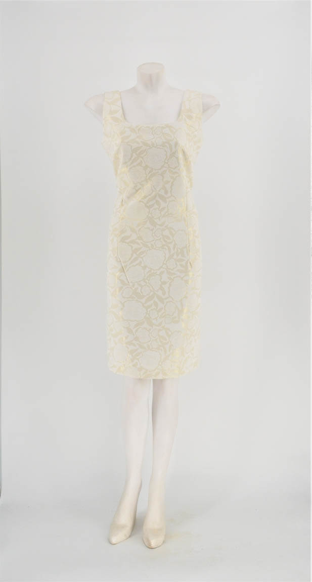 Mini white sleeveless dress in a straight line with gold metallic pattern on the weave