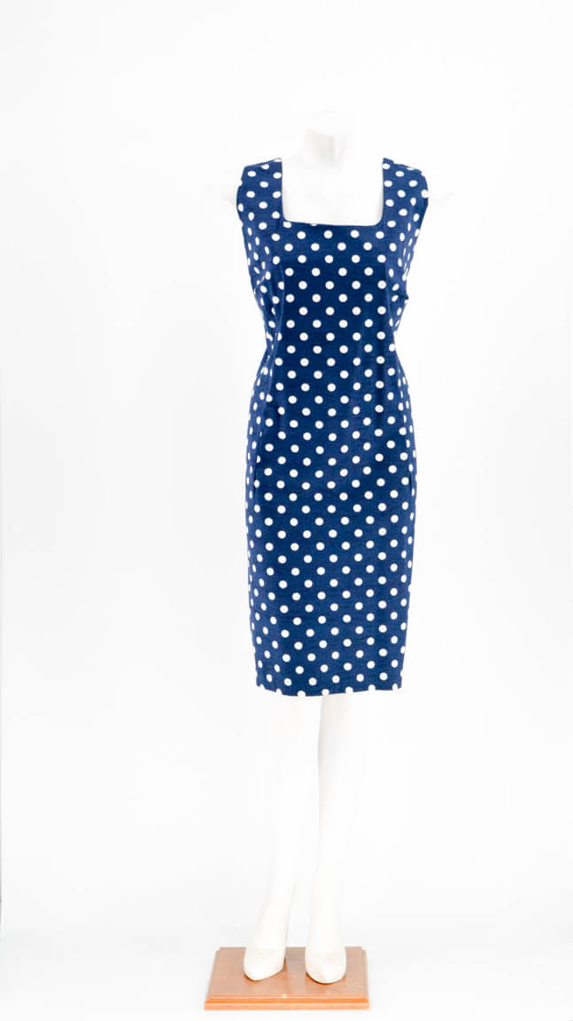 Short sleeveless polka dot dress in a straight line with a square neckline.