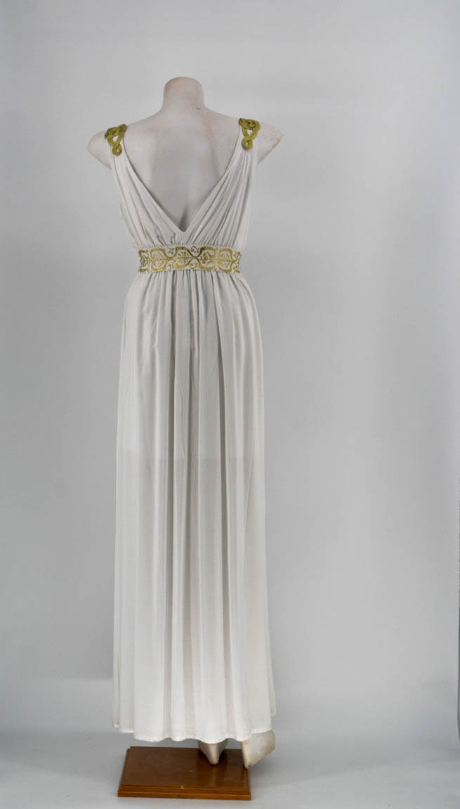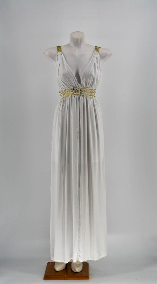 Impressive evening maxi white dress, with gold embroidery on the shoulders and belt